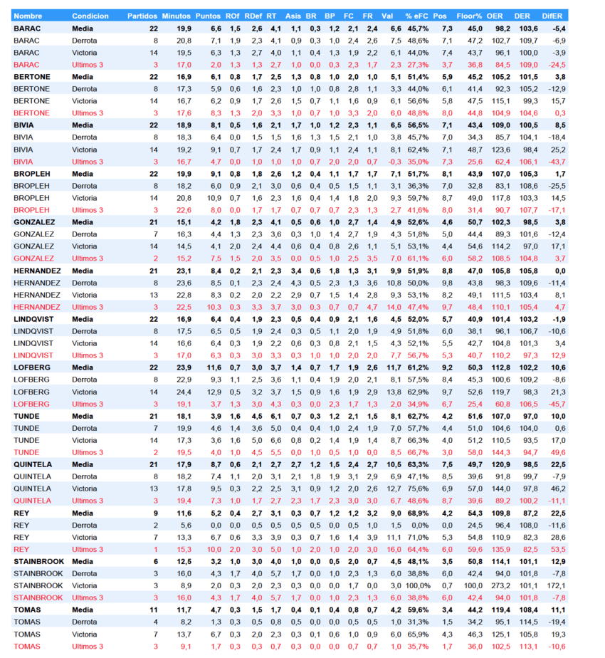 - Tomás. 119 de OER medio, 125 en las victorias, 95 en las derrotas y 102 en los últimos 3 con una diferencia de -10,6. Es un gran tirador con los pies en el suelo y lo aprovecha, pero su rendimiento defensivo es muy bajo (DER medio 108; 113 en los últimos 3 partidos)