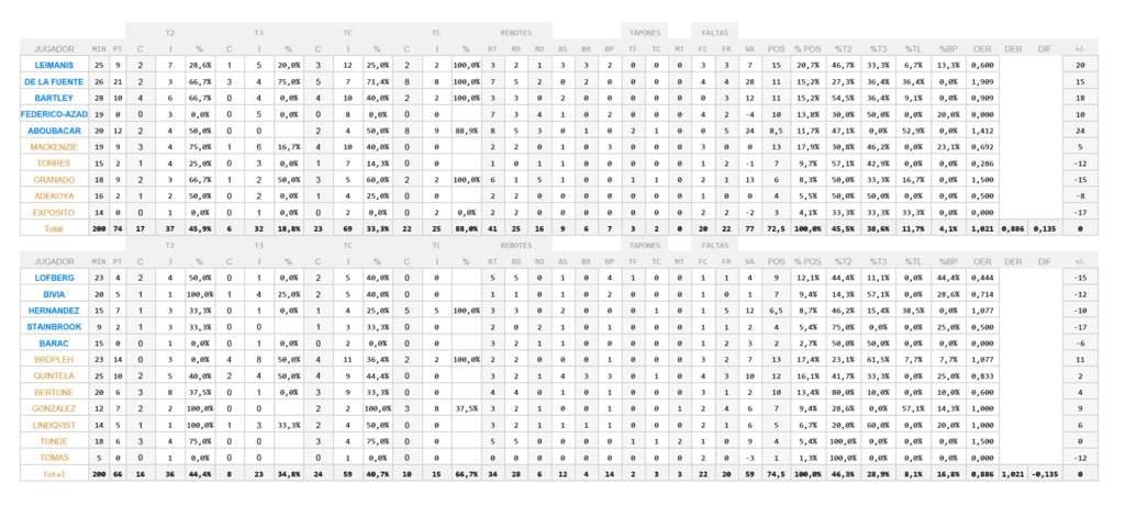 El grupo dirigido por Felix Alonso pierde porque permite que Las Ardillas lancen 10 tiros de campo y otros 10 tiros libres más. ¿Por qué? Pues porque los de Hugo López, liderados en esa faceta por un colosal Aboubacar, capturan 16 rebotes ofensivos (¡El 36% de los rebotes bajo canasta mallorquina!) y porque fuerzan 14 Balones Perdidos (casi el 17% de las posesiones) de los palmesanos.