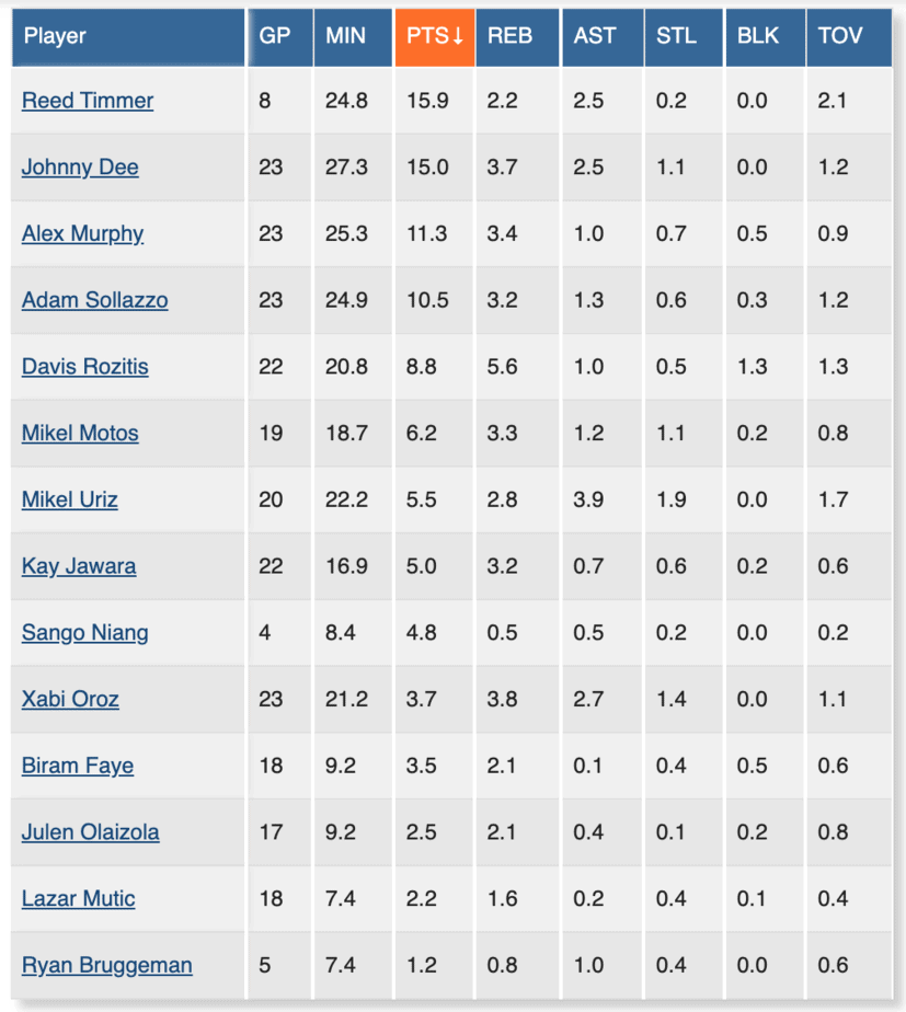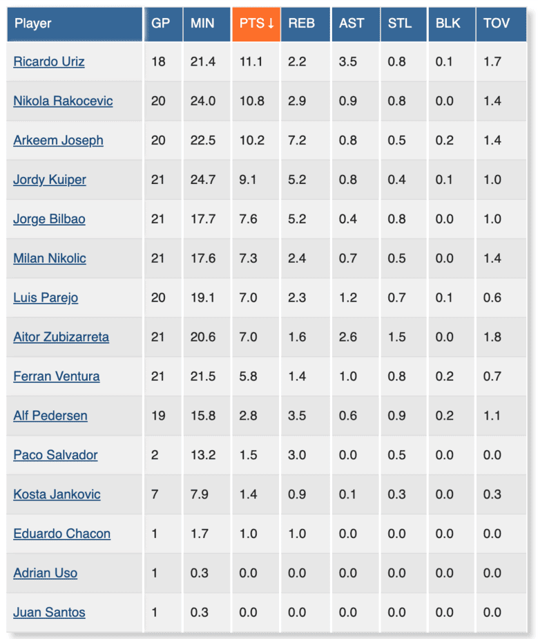 - Tomás. Alero. OER 1,052. 5,5% de las posesiones, lanzando el 52% en tiros de 3 puntos. Rotación de calidad que cuando está en pista es una gran amenaza desde los 3 puntos.