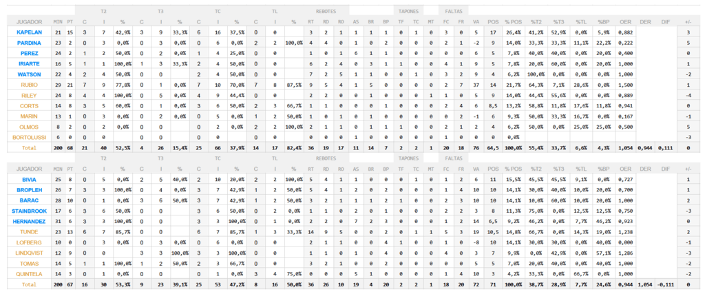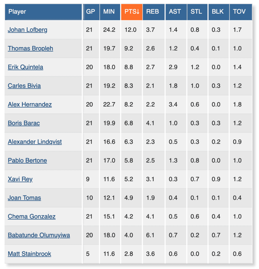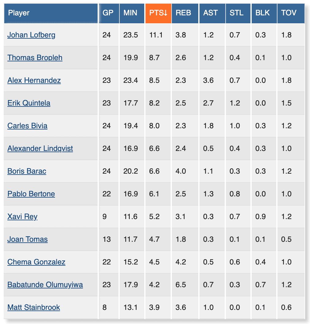 - Lofberg. Alero. OER 0,978. 14% de las posesiones con el 45% en tiros de 2 puntos y el 28% en tiros de 3. Venía de 3 partidos malos, pero el domingo se resarció. EL movimiento le sienta fenomenal y tiene un fade away portentoso. Su temporada está siendo buena y puede terminar mejor.